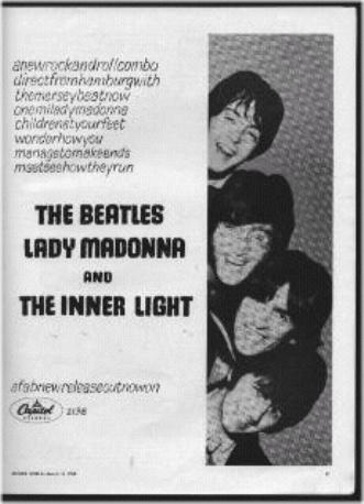 March 16, 1968 - Capitol Records presented a full page ad in Billboard and Cash Box Magazine promoting the single Lady Madonna. This was a b/w advertisement.