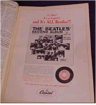 April 11, 1964 - Capitol Records presented a full page ad in Billboard Magazine promoting the new LP The Beatles Second Album. It was titled in "It's Here! It's on Capitol!! and It's All Beatles!!!". This was a 2 color advertisement. A poster with the same graphics was also made; see the record promo poster section for details on that item.
