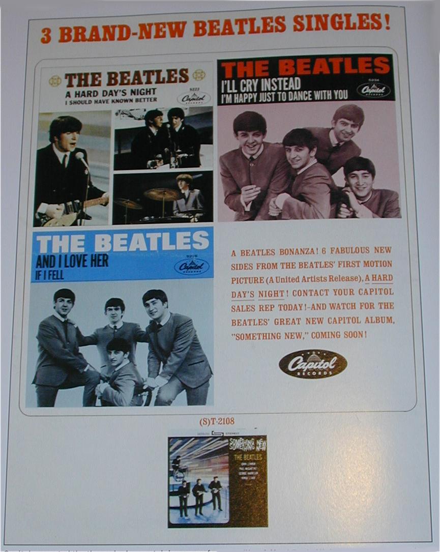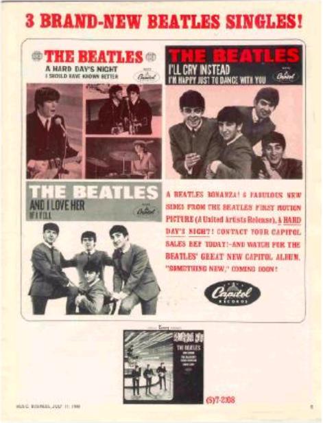 July 11, 1964 - Capitol Records presented a full page ad in Billboard Magazine promoting 3 Brand New Singles on Capitol Records: A Hard Day's Night, I'll Cry Instead and And I Love Her. Pictured at the bottom of this ad was the Something New LP on Capitol. This Billboard advertisement was in full color. A 2 color version of this same ad was run in Record World Magazine on July 11, 1964.