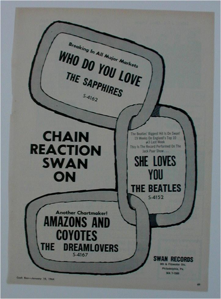 January 18, 1964 - Swan Records presented a full page ad in Billboard and Cash Box Magazine promoting the new Swan single She Loves You.
