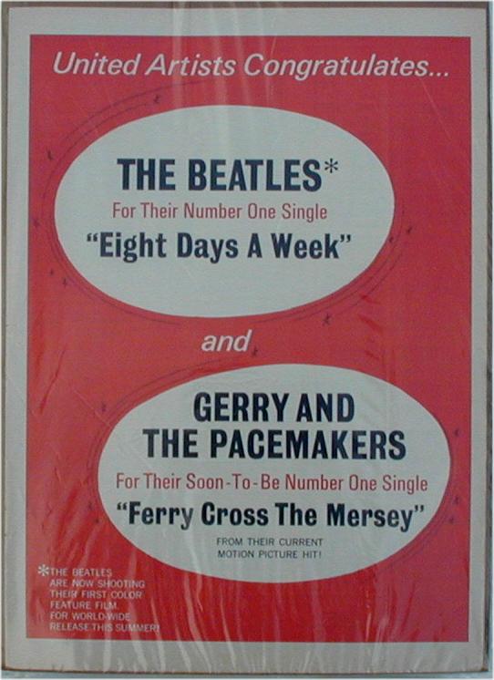 February 1965 - United Artists Records presented a full page ad in Billboard Magazine congratulating The Beatles on their number one single Eight Days A Week and also promoting the new upcoming motion picture A Hard Days Night.