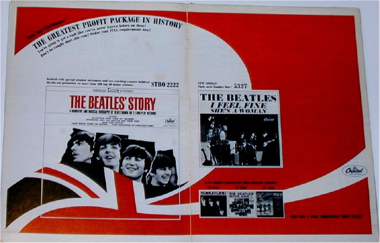 November 28, 1964 - Capitol Records presented a 2 page ad in Billboard and Cash Box Magazine promoting the new LP The Beatles Story plus the new single I Feel Fine Their previous 3 LP's on Capitol Records are also pictured. This ad featured a red background and was titled "The Greatest Profit Package In History".