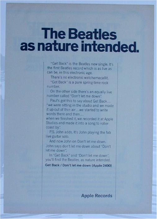 May 1969 - Apple Records presented a full page ad promoting the new Beatles single Get Back.