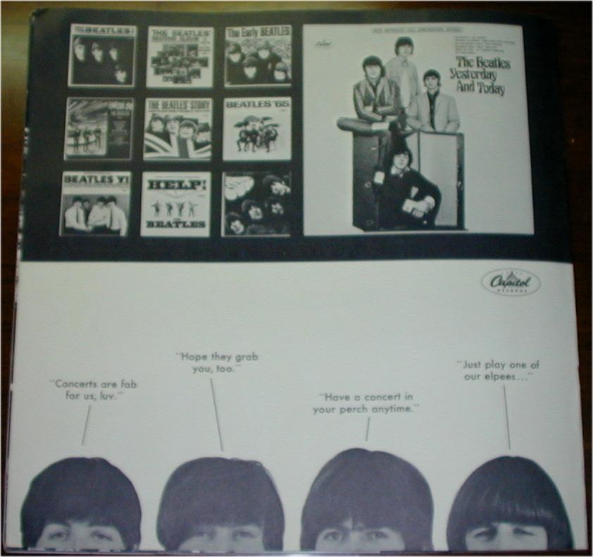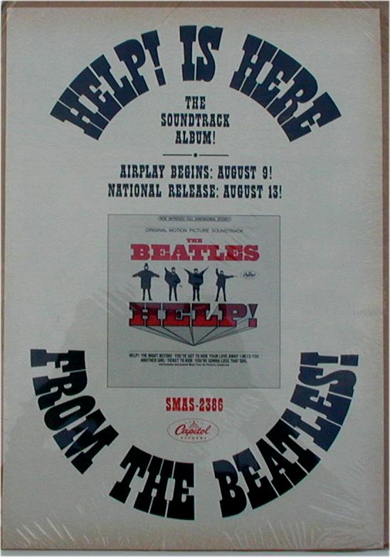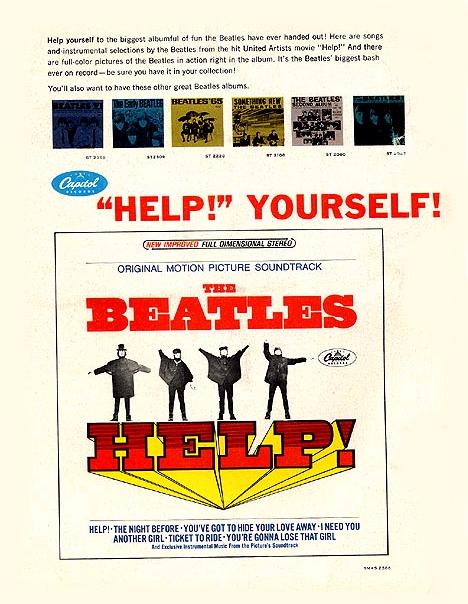 August 14, 1965 - Capitol Records presented 2 ads for the HELP! album: the first, a full page ad in Billboard Magazine promoting the new LP with a color picture of the LP jacket pictured in the center. The second, a great full color ad, entitled "HELP! YOURSELF", appeared in various teen magazines and featured all The Beatles albums available to date at the top.