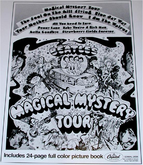 December 9, 1967 - Capitol Records presented a full page ad in Billboard Magazine promoting the LP Magical Mystery Tour. This was a b/w advertisement with lots of cartoon-type drawings from the movie.