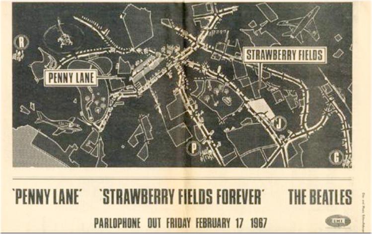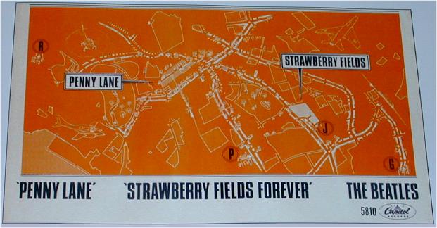 February 25, 1967 - Capitol Records presented a full page ad in Billboard and Cash Box Magazine promoting the single Strawberry Fields Forever. This was an orange background advertisement showing a map of Liverpool and where each Beatle originally lived. A cardboard window card with the same graphics was also made; see the record promo poster section for details on that item.