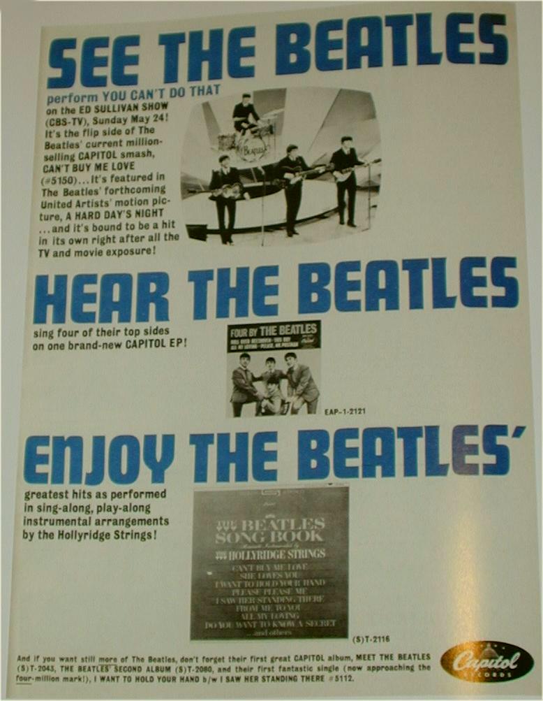 May 23, 1964 - Capitol Records presented a full page 2 color ad in Billboard Magazine promoting the new single Can't Buy Me Love and the Four By The Beatles EP. It was titled in large blue letters "See The Beatles, Hear The Beatles, Enjoy The Beatles".
