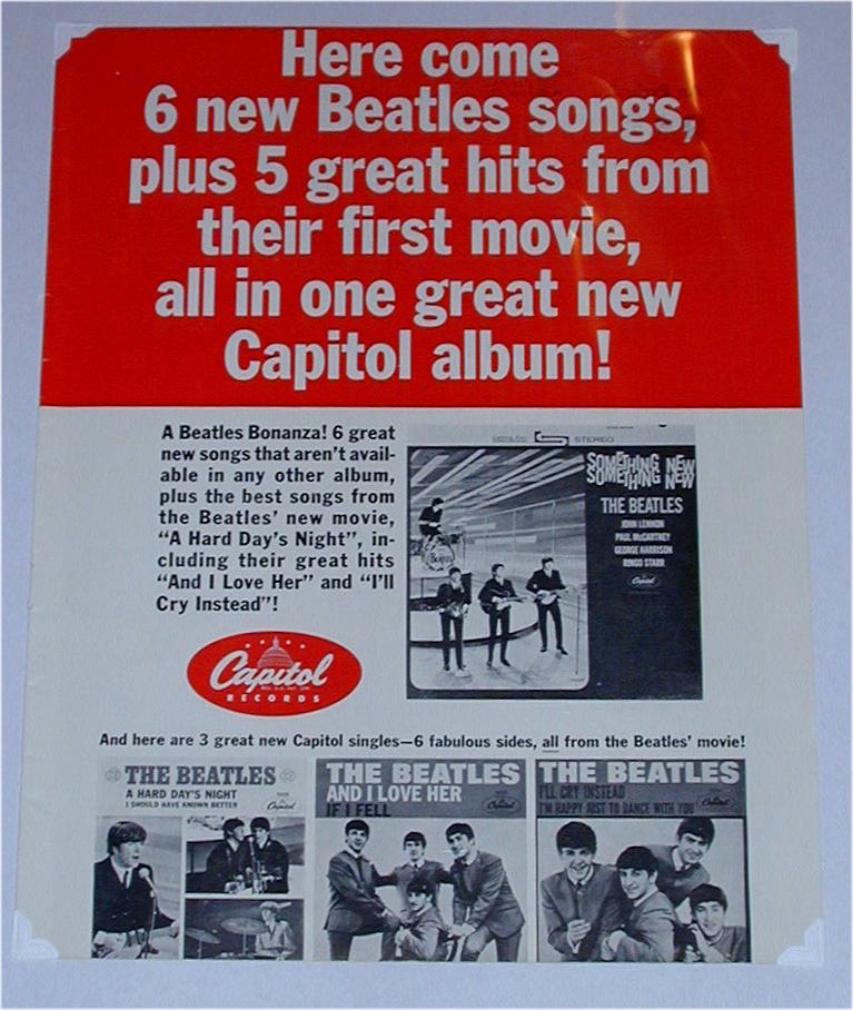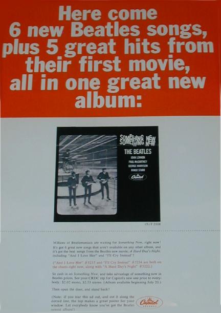 July 25, 1964 - Capitol Records placed a full page ad in Billboard and Cash Box Magazine promoting the new LP Something New. It was titled in "Here come 6 new Beatles songs, plus 5 great hits from their first movie, all in one great new album:". The top has white printing on a red background with a b/w photograph of the LP below. 2 Different ADs were made.