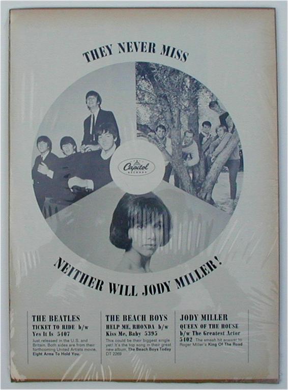 April 17, 1965 - Capitol Records presented a full page ad in Billboard Magazine promoting the single Ticket To Ride and 2 other groups singles. A b/w picture of The Beatles along with The Beach Boys and Jody Miller appeared in the center of the ad.