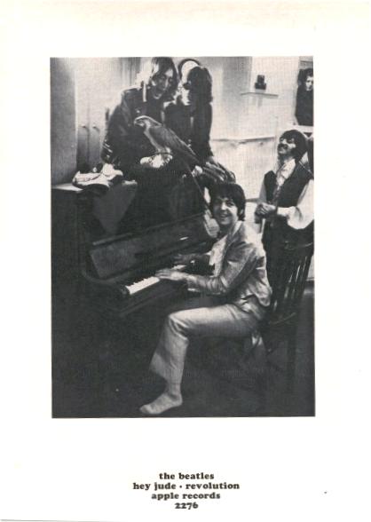 October 5, 1968 - Apple Records presented a full page ad in Cash Box Magazine promoting the new Apple single Hey Jude. This same ad was printed in Billboard Magazine in their October 12, 1968 issue. A rare UK promotional poster was made of this same ad; see our Record Promo Section for a description of that item.