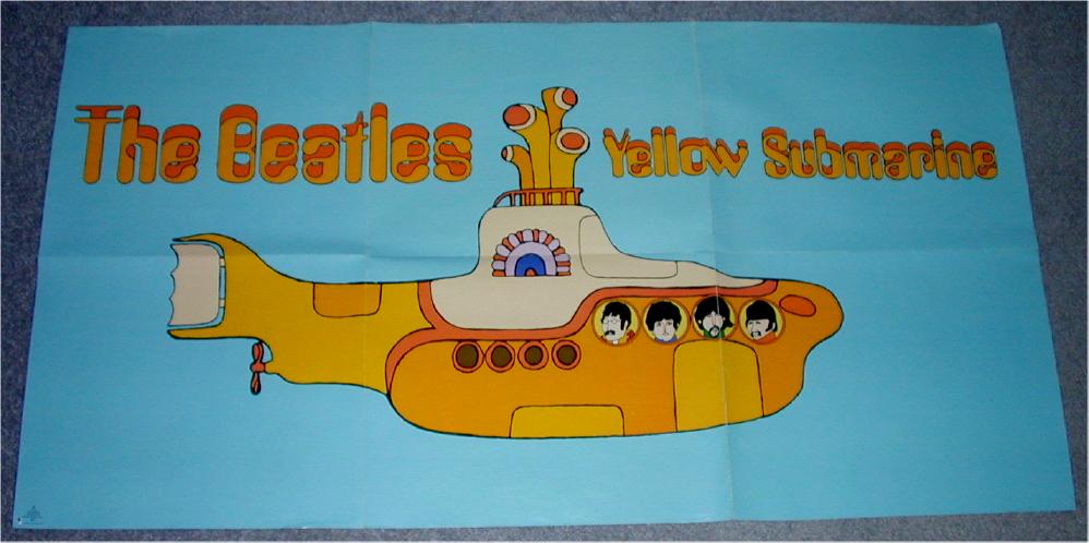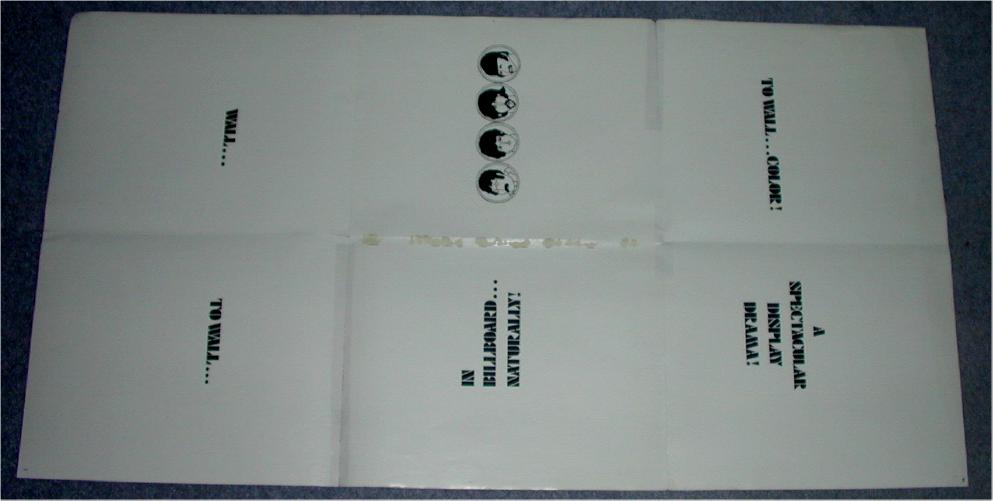 January 25, 1969 - Capitol/Apple Records inserted a 20" x 37" full color promotional poster in Billboard Magazine promoting the new LP The Beatles Yellow Submarine. This is nearly the same poster as the regular album promotional poster made by Capitol/Apple Records for in-store use for The Yellow Submarine LP; the front of the poster is identical; the regular promo poster did not have any printing on the backside except for the 4 pictures of The Beatles; the in-store promo poster also was not folded, it was rolled. Click here to view that poster.
