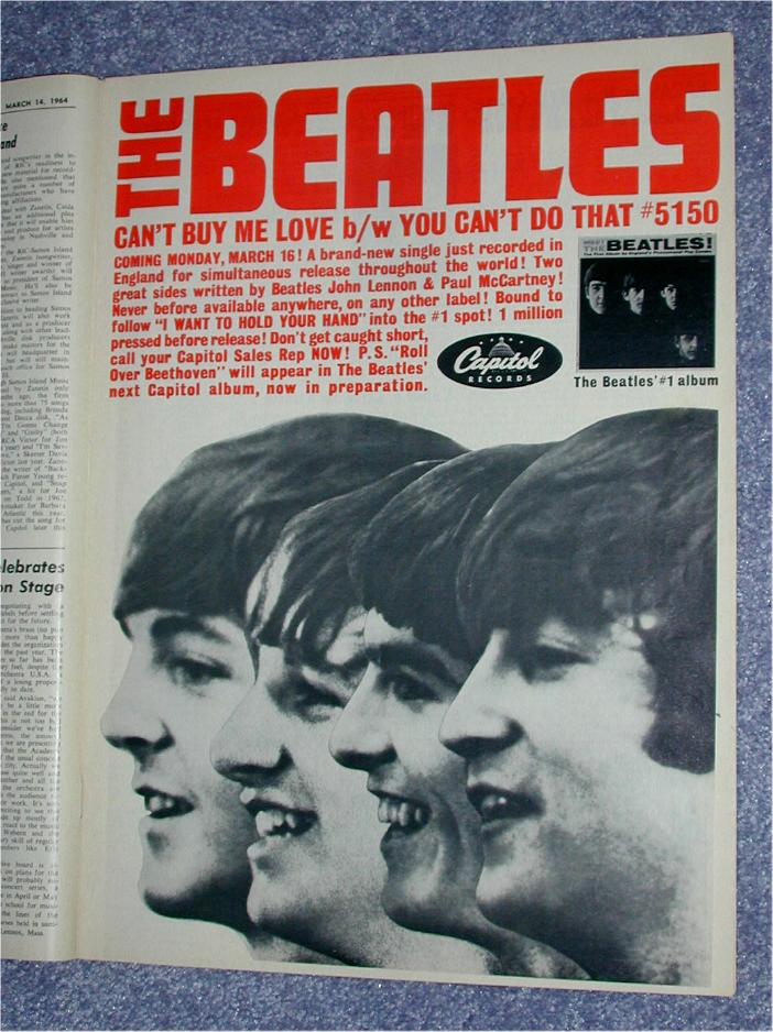 March 14, 1964 - Capitol Records presented a full page ad in Billboard and Cash Box Magazine promoting the new single Can't Buy Me Love. The ad depicted 4 large head shots of The Beatles with large red lettering at the top. A very rare Poster with nearly the same graphics was also manufactured by Capitol Records; see the Record Promo Section for details on that item.
