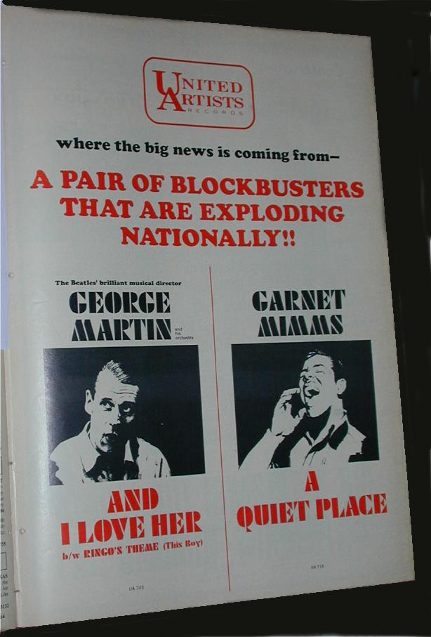 August 1, 1964 - United Artists Records presented a full page ad in Billboard Magazine promoting the George Martin Orchestra single release And I Love Her b/w Ringo's Theme(This Boy). This advertisement was a 2 color ad and featured a photograph of George Martin