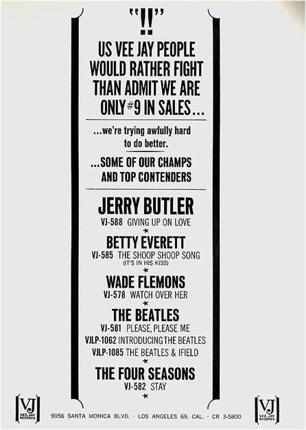 March 7, 1964 - Vee Jay Records presented 2 ads in Billboard Magazine promoting Twist and Shout, Please Please Me, Introducing The Beatles, and The Beatles and Frank Ifield on Stage. The same ad ran in Music Vendor Magazine on March 14, 1964.