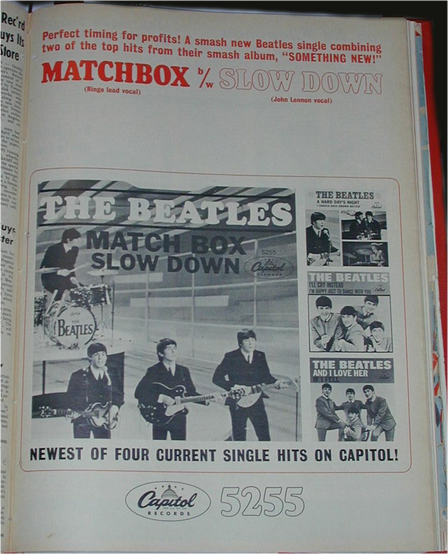 August 29, 1964 - Capitol Records presented a full page ad in Billboard Magazine promoting the singles MatchBox, A Hard Day's Night, I'll Cry Instead and And I Love Her.
