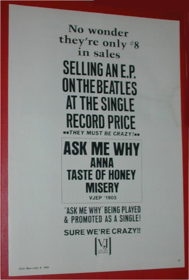 July 4, 1964 - Vee Jay Records presented a full page ad in Billboard and Cash Box Magazine promoting the VJ 1-903 EP "Souvenir of Their Visit to America"