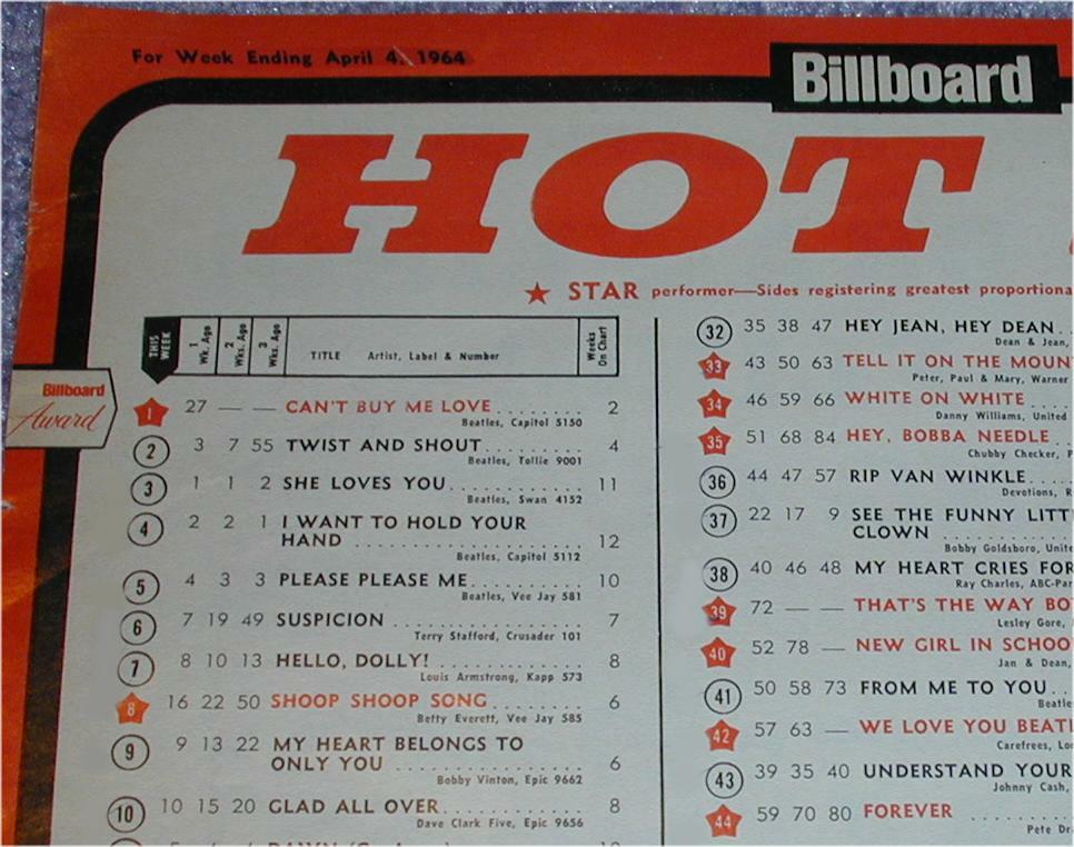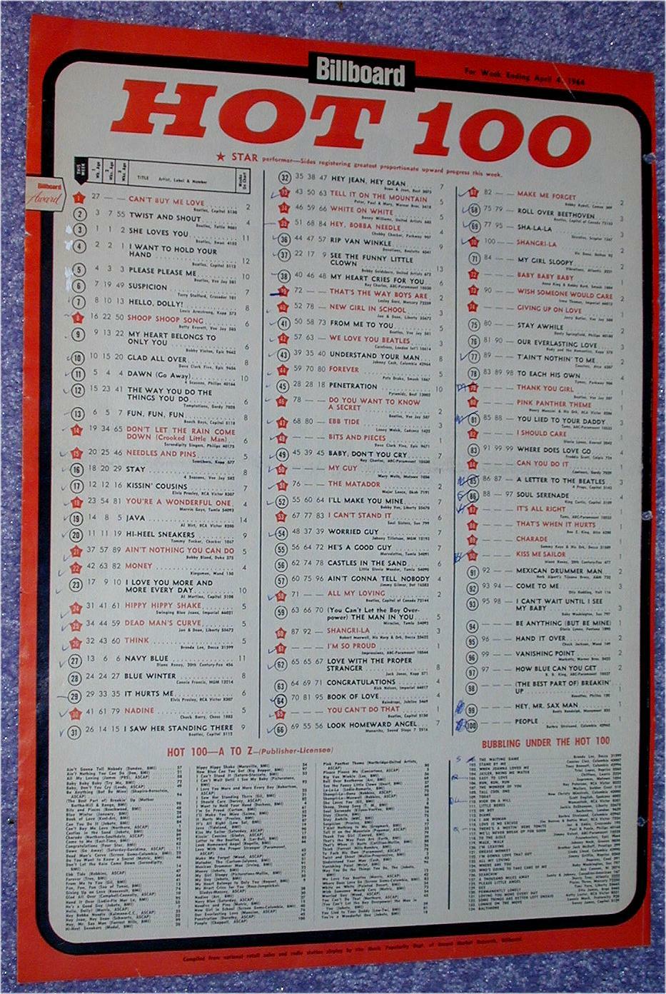 April 4, 1964 - There were no ads in this issue of Billboard Magazine BUT this is the week that The Beatles occupied the top 5 positions of Billboard's Hot 100 and they also occupied the top 2 positions for Billboard's LP chart!!!!!