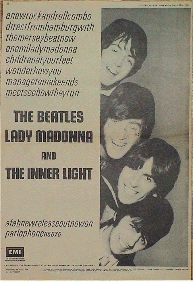 March 16, 1968 - EMI Records in the UK presented a full page ad in Record Mirror Magazine promoting the single Lady Madonna. This was a b/w advertisement.