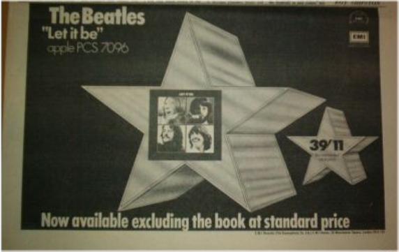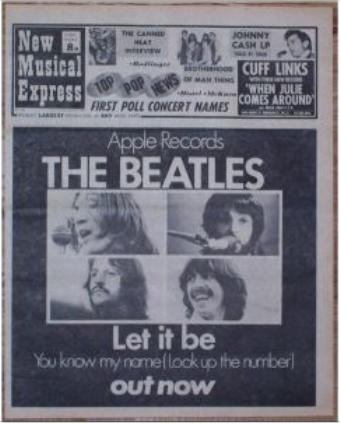 March 1970 - Apple Records presented a half page ad in UK New Musical Express Magazine promoting the new single, Let It Be. This was a B/W advertisement that measures approx. 13" x 18".