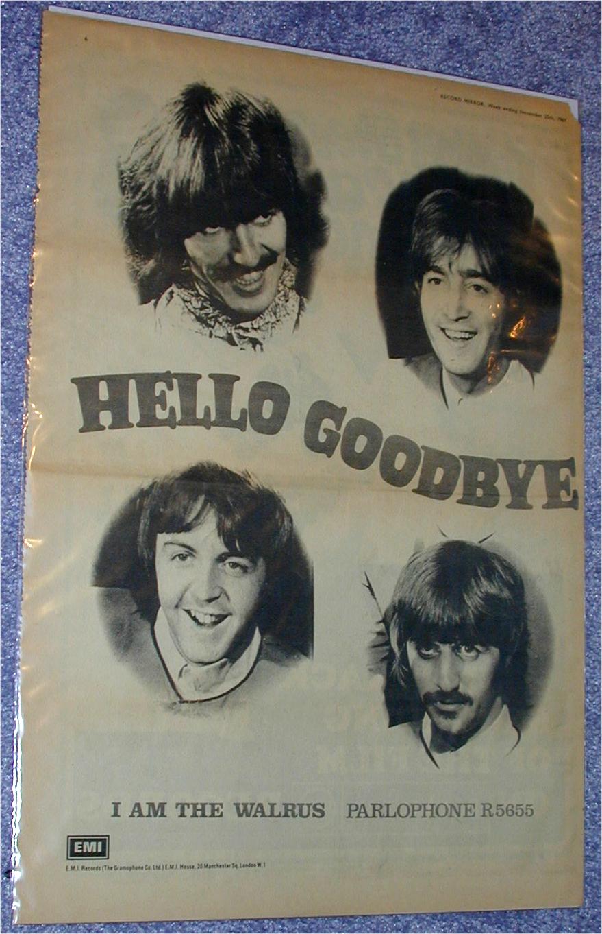 November 25, 1967 - EMI Records presented a full page 11"x 15" ad in a British Pop Magazine promoting the new Parlophone single Hello Goodbye. This was a b/w advertisement with great photos of each Beatle..