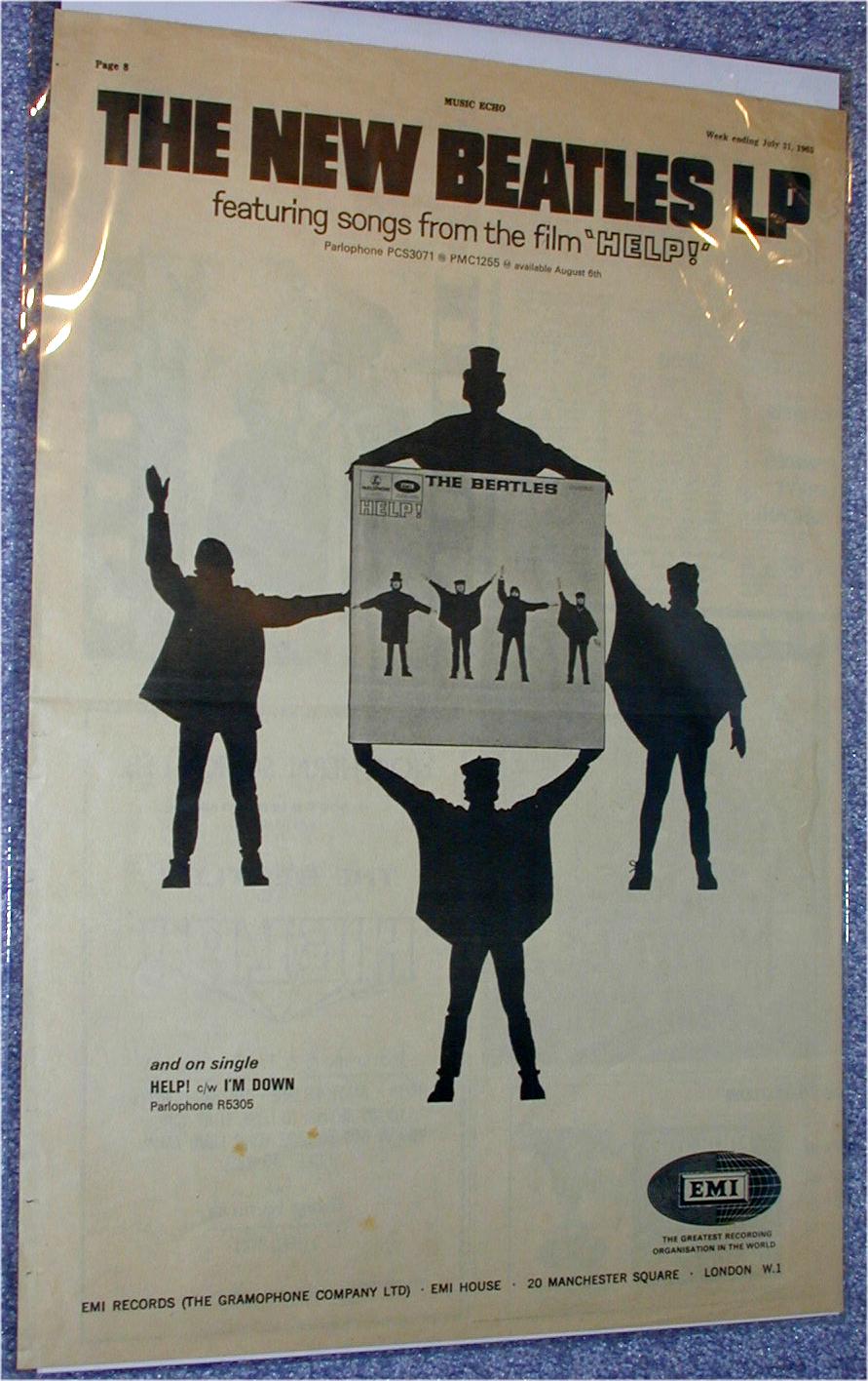 July 31, 1965 - EMI Records in the UK presented a full page ad in Music Echo Magazine promoting the new single and album HELP!. The UK album cover is pictured in the center of the ad.