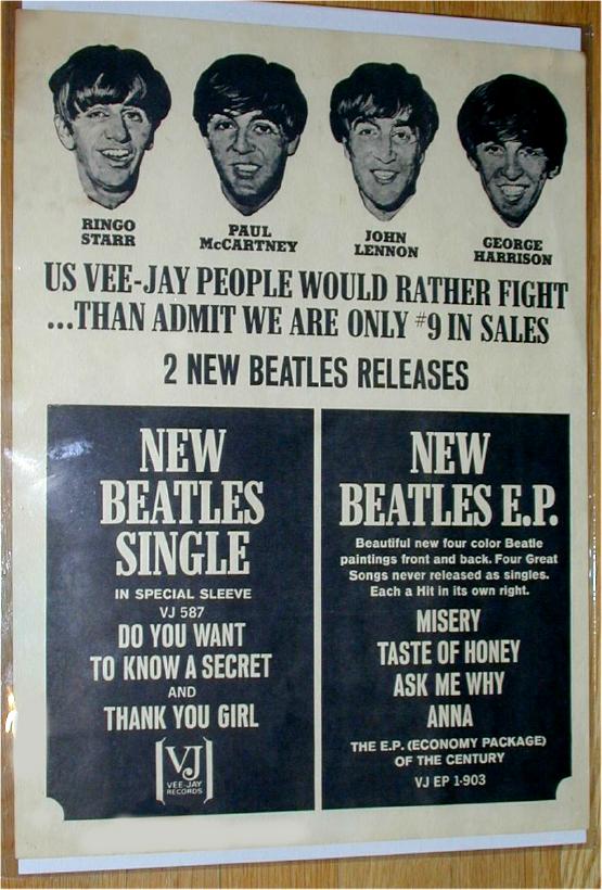 March 21, 1964 - Vee Jay Records presented an ad in Billboard Magazine promoting the single Do You Want To Know A Secret and the EP Souvenir of Their Visit to America. A very rare poster of this same AD was produced on cardboard; see the Record Promo Section for details on that item.