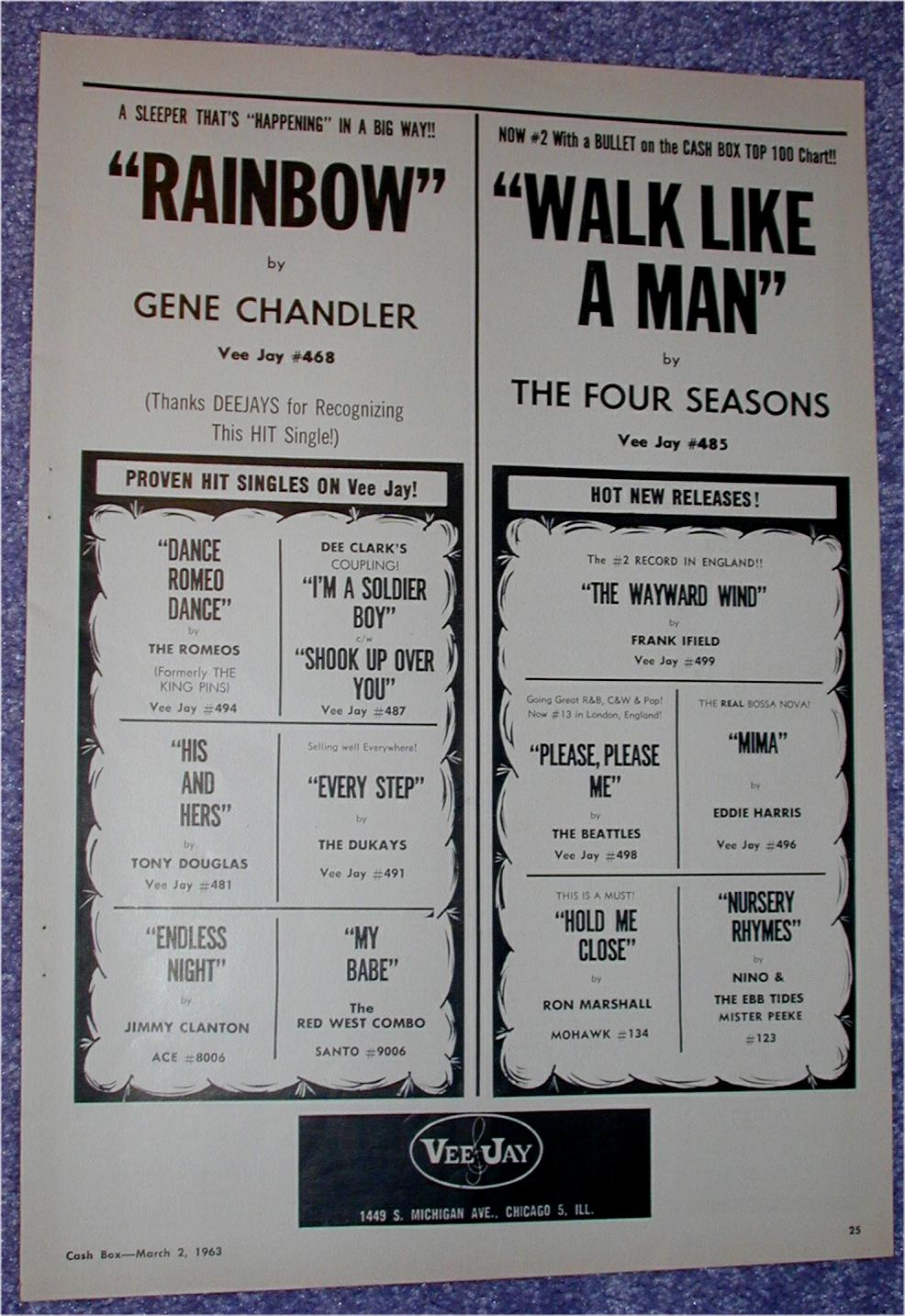 October 17, 1964 - Vee Jay Records presented a combo Ad in Billboard Magazine promoting The Beatles vs. The Four Seasons and Songs, Pictures and Stories of The Fabulous Beatles.