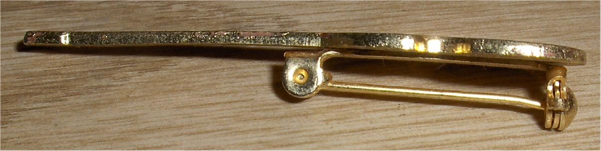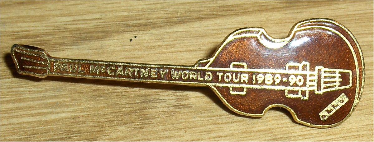 Item SL001.  A Paul McCartney Metal Guitar Brooch promoting his 1989-1990 World Tour!!!   Offered is a 2.5" long gold colored metal brooch of Paul's Hofner bass guitar that was sold at concerts in the USA during his 1989-90 Tour.   It has a pin attachment on the backside.  Overall in NM condition.   Price $35.