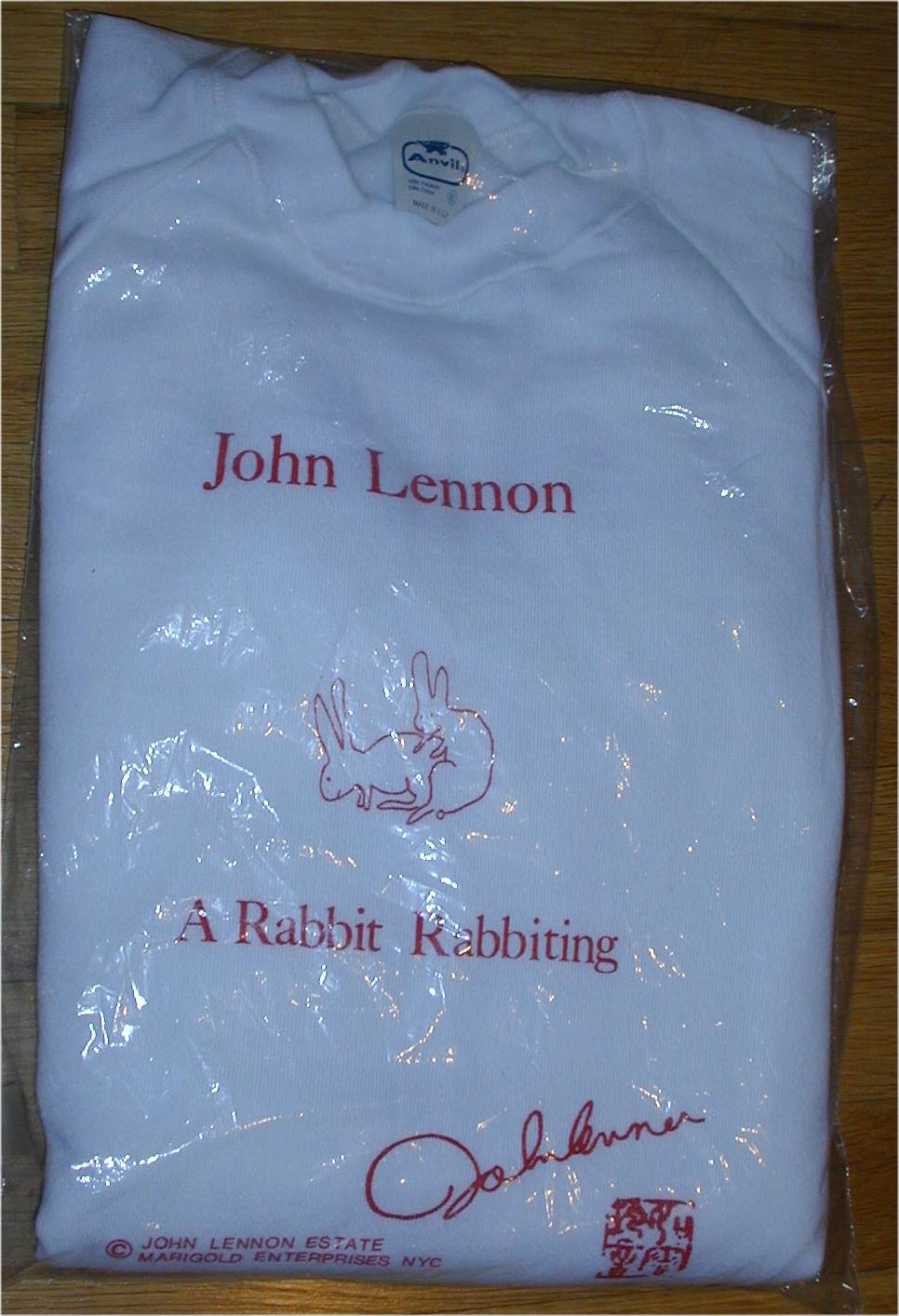 Item SL010.  A John Lennon Promotional T-Shirt!!   This was produced in 1982 by The John Lennon Estate.  It's titled "A Rabbit Rabbiting".  In Brand New condition. The back is blank.  Made from one of John's original drawings!!!  A white, long sleeved sweatshirt.  A Very Cool Item!!!  The size is XL.  Purchased in 1982 and put away in a baggy so it's still in brand new condition.   Price $89