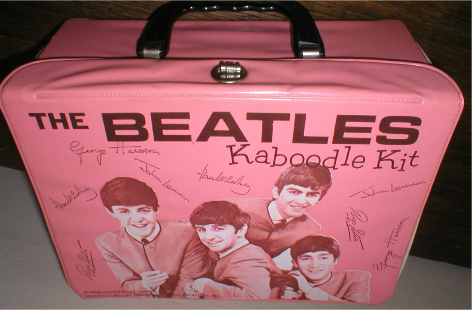 The Beatles Kaboodle Kit was manufactured and sold in the USA by Standard Plastic Products (SPP) in 1964. SPP also manufactured pencil cases, wallets and 3 ring binders. 9 different colors of Kaboodle Kits are currently known: red, light blue, dark blue, yellow, hot pink, light pink, peach, lavender, and beige(or tan). None of them are considered by experts any rarer than another. We have seen probably an equal amount of all colors over the past 25 years. Considered to fall under the lunchbox category today by many collectors however it was not sold as a lunchbox originally - it was a Kaboodle Kit...meant to put knick-knacks and treasured items inside!!! Many kids who got these originally did use them as a lunchbox. Please note that this item was not issued with any kind of a thermos. The Kaboodle Kit is considered a "MUST HAVE" item for all Beatles memorabilia collectors! Shown below are all 9 known colors!