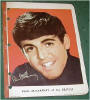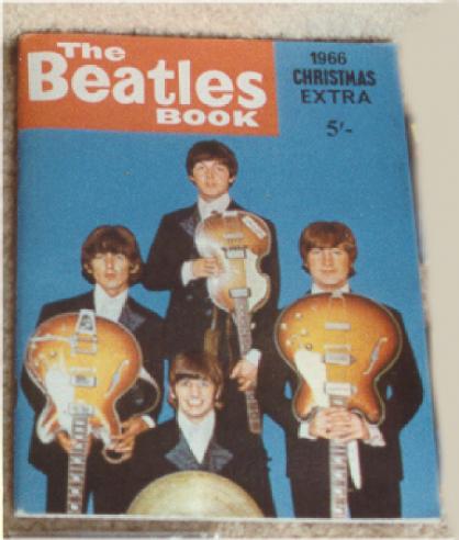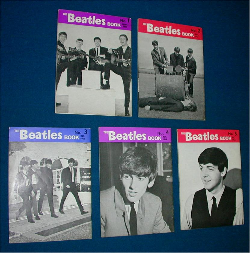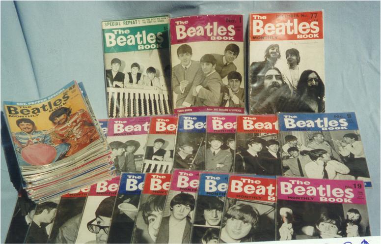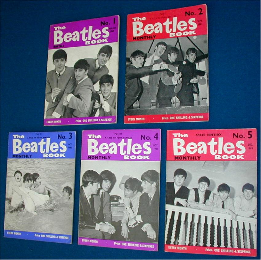Beatles Monthly Magazines were mfg by the Official Beatles Fan Club in the UK. Each month a new booklet was issued. Number 1 is hardest to find. Issues 1 - 77 plus a couple of Christmas Specials in 1965 and 1966 were made. These have been reproduced so you'll need to have an original one handy when examining the repros as they were done extremely well. A grey cloth binder was mfg in the UK to hold your Beatles Monthlies - this item has not been reproduced nor have the Christmas Extras.
