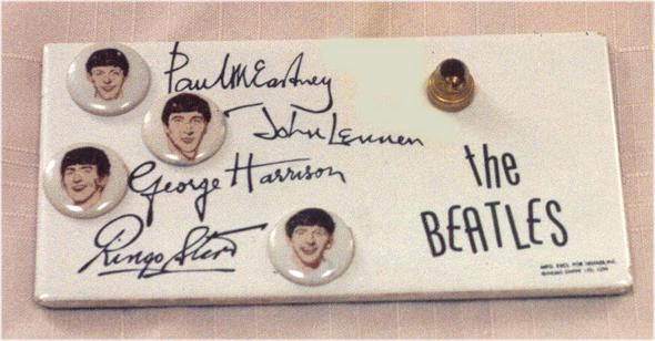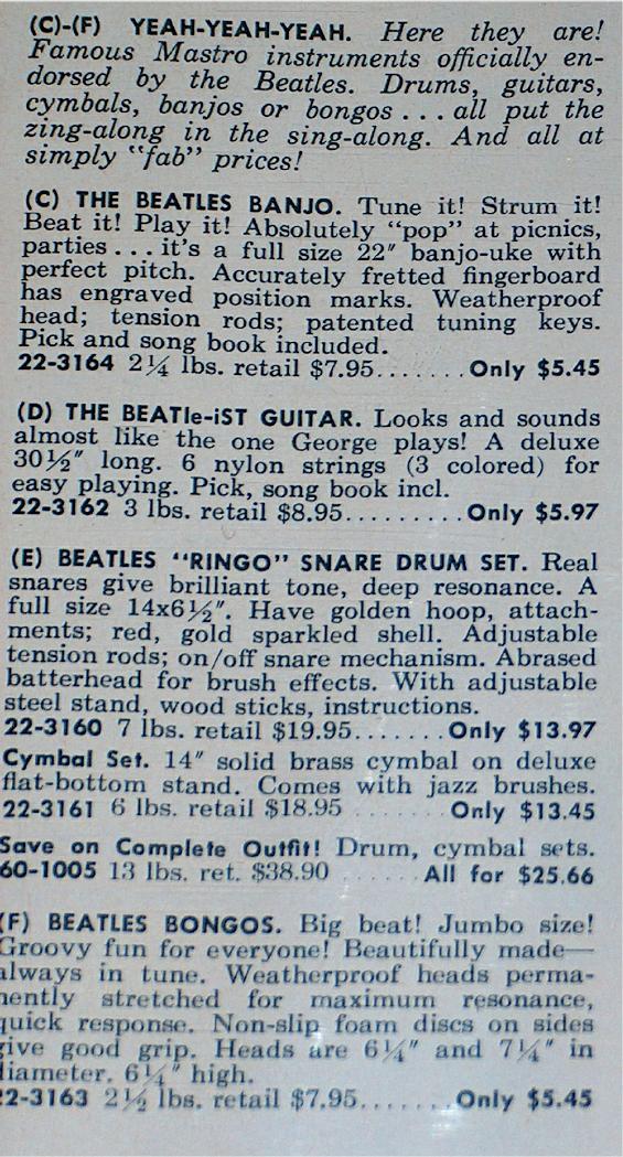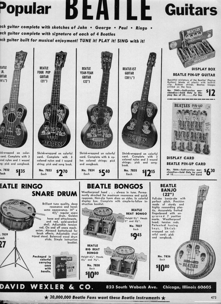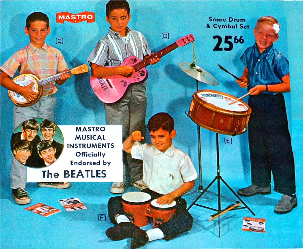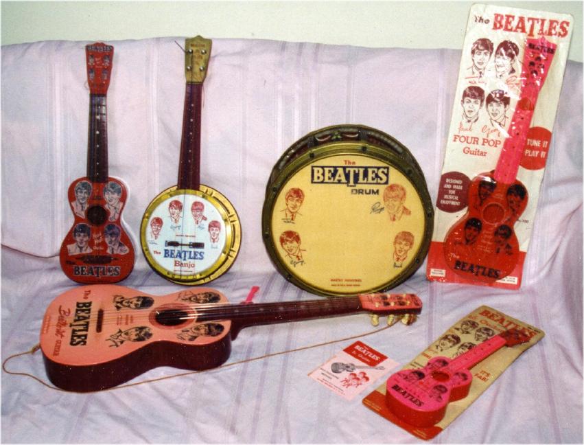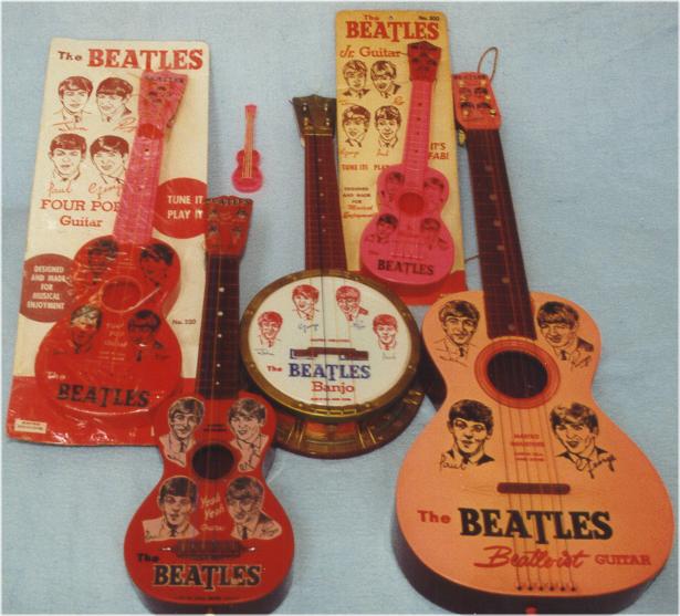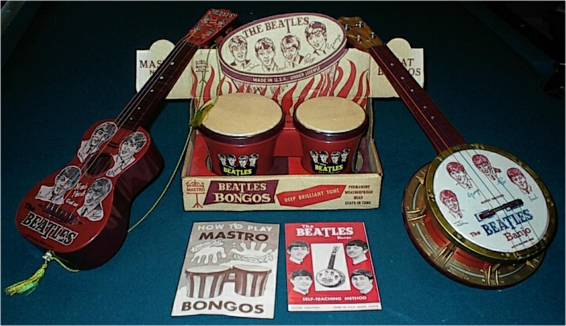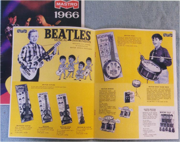 M is for Mastro Industries which made some of the most desirable Beatles memorabilia in the 1960's. Collectors love these items!!! Shown is an assortment of toy instruments. Click here for more detailed information on Mastro Industries and the items they made. Click here to read an article in Vintage Guitar Magazine about the creator of Mastro Industries, Mario Maccaferri; it is very interesting reading and it also addresses the licensing agreement he received to exclusively produce Beatles toy instruments back in 1964 for the USA. By mid summer 1964, Mastro had reportedly shipped 500,000 toy instruments out to consumers and they were projecting 2,000,000 by years end!!! Wow, where did they all go?; especially the Beatles promo models where as few as half a dozen exist for some models. As a matter of fact, there has not yet been even one documented case of a promotional Beatle-ist Guitar!!! They certainly were made as they have appeared in vintage photographs. As of this writing in early 2004, these are the estimated numbers of Beatles Promotional Guitars by model type: Junior Guitar = 3, Four Pop Guitar = 2, Yeah Yeah Guitar = 5, Beatle-ist Guitar = zero! If you find one out there, please contact us and send us photographs for our Reference Library. We can also almost guarantee we can sell that Promo guitar on consignment for you for at least $10,000 US Dollars!