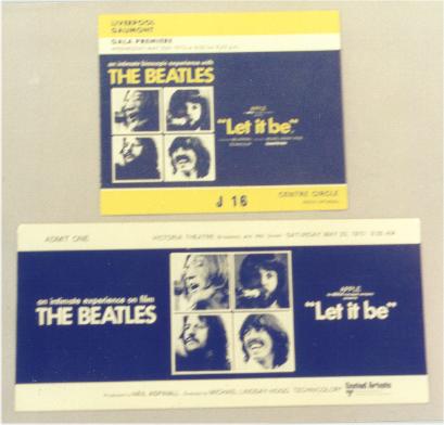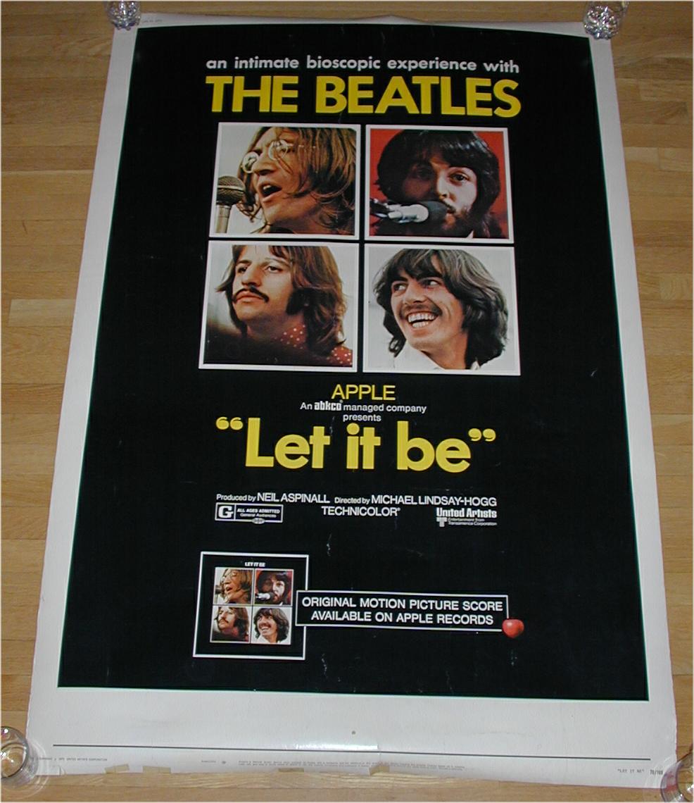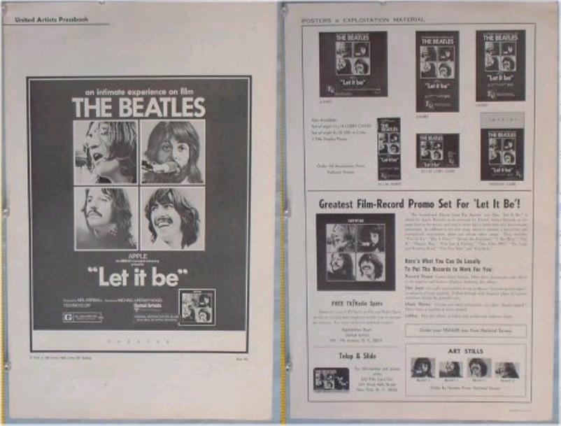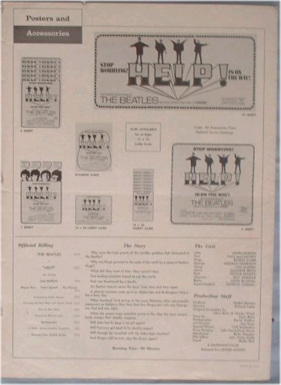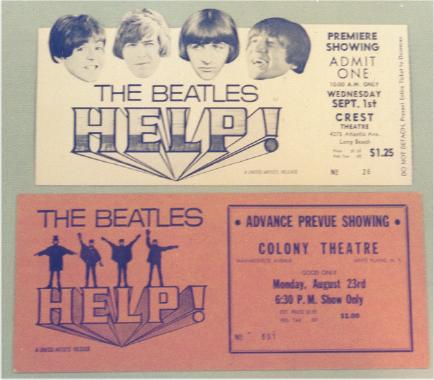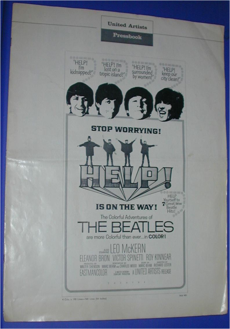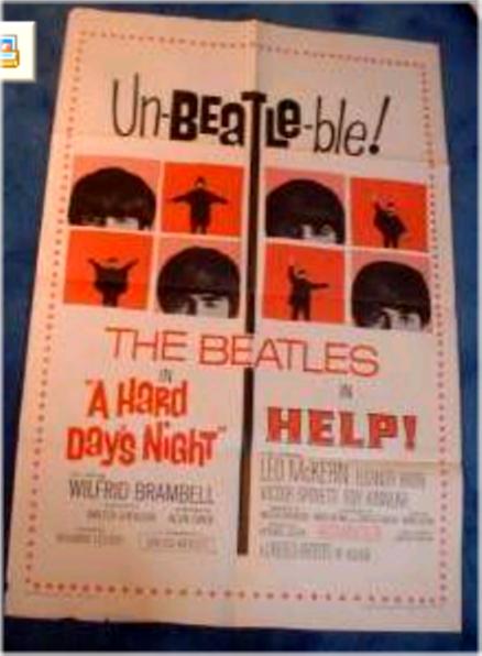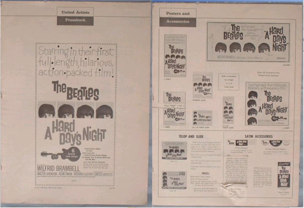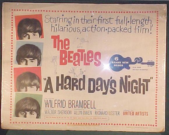 Movie Items and Posters were mfg by United Artists for A Hard Days Night, HELP!, Yellow Submarine and Let it Be motion pictures. Original United Artists movie posters came in a variety of sizes from Window Cards, Insert Posters, half-sheet, 1 sheet, 3 sheet, 6 sheet and 24 sheet. The 1 sheet poster has been widely reproduced. Also produced were 40"x60" oversized 1 sheet posters on poster board - these versions are highly sought. Many other items were produced for the Beatles' movies such as tickets, giveaways and movie programs. See other sections for additional information. See the UK Yellow Submarine Movie Premiere Ticket or Yellow Submarine Movie Posters or Press Books for additional movie items.