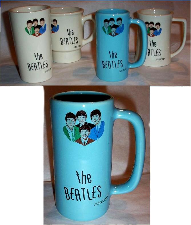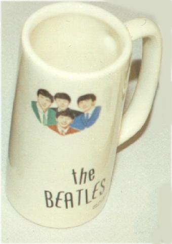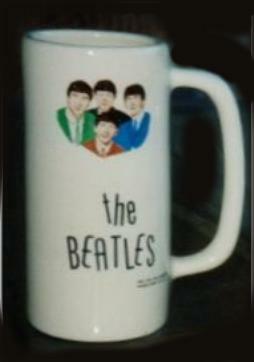 A Beatles ceramic drinking Cup or Mug mfg by Washington Pottery UK 1964. Some are stamped England on the bottom. Several minor variations of this item were made such as a straight or flared top and handle variations. See also tumblers and glasses.