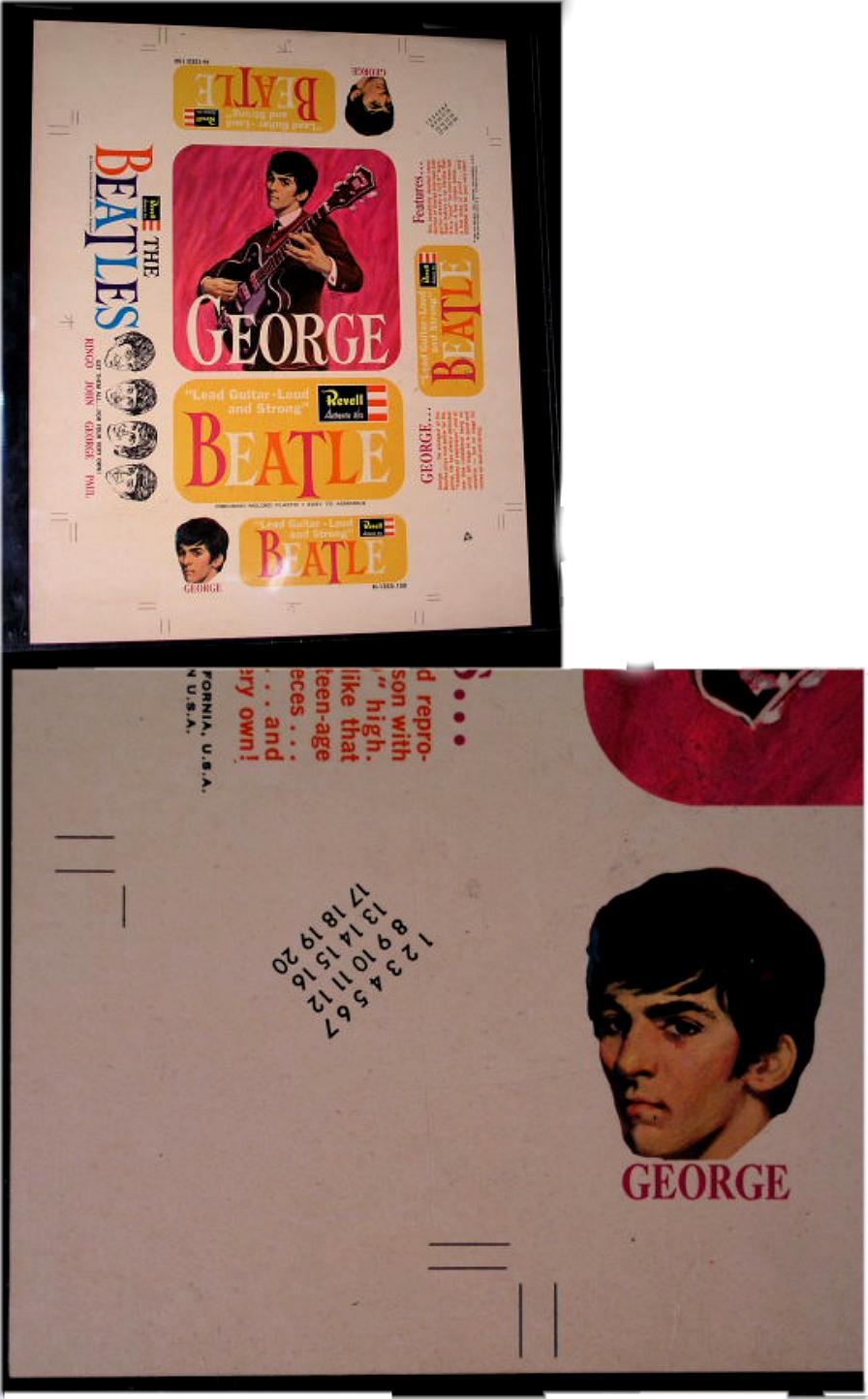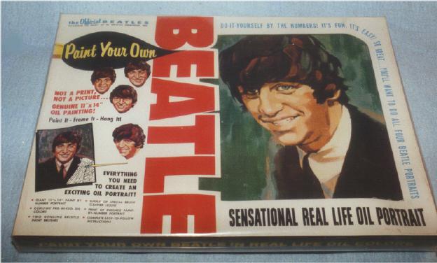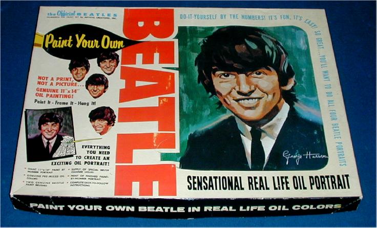 Paint by Number Kits mfg in the USA in 1964 by Artistic Creations (actually a Pat Boone cash-in on the Beatles). Large box contained a completed paper portrait, a paint by number portrait, paint brush, paints and thinner. A very large box with nice graphics. One of each Beatle was made. These originally came sealed in shrink wrap.