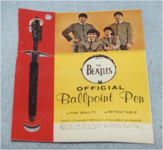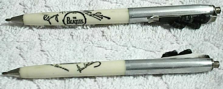 Beatle Ink Pens were mfg by several vendors in 1964. All four Beatles heads in cast metal are mounted on the front clip (see close-up photograph for detail). The plastic barrel of the pen has The Beatles logo in a drum head along with facsimile signatures of each Beatle. The front plastic barrel is known to exist in the following colors: white, green, blue, red and black