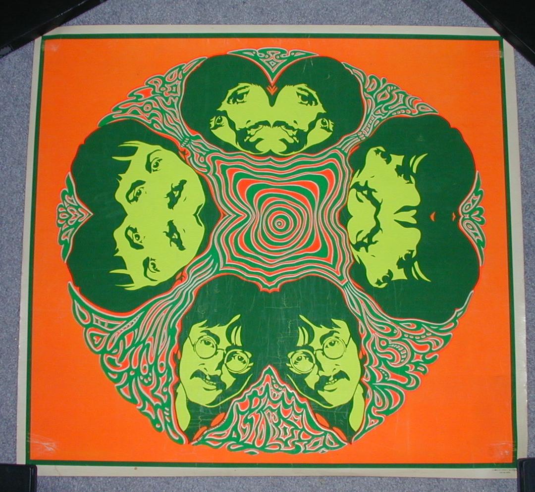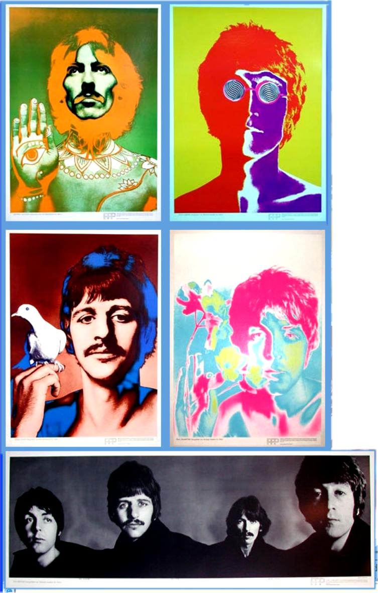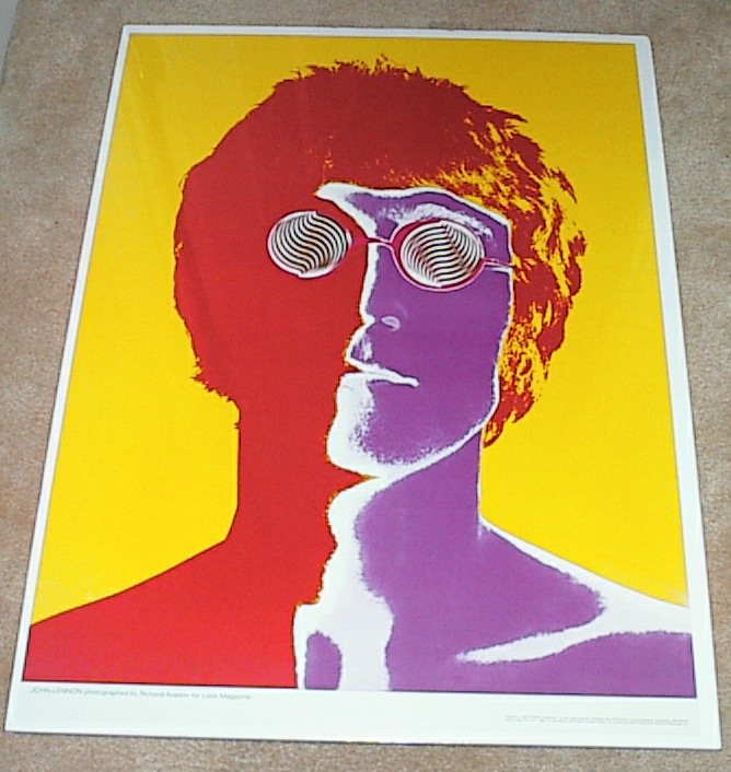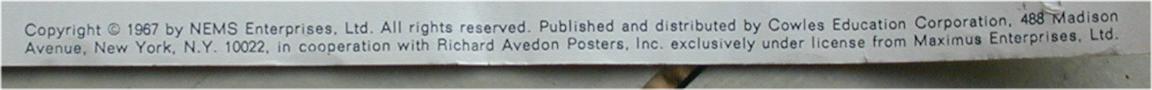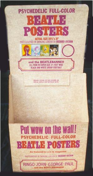 Posters by Richard Avedon circa 1967 and mfg by LOOK Magazine in the USA. This poster was also manufactured in both England and France with the foreign versions being smaller than the USA versions. The French Set was produced by Stern Magazine and the 4 Beatle posters measure exactly 19" x 27" and the French Banner poster measures 14" x 40"(see photo below). A French display bin is also pictured below in black/white. A set of four 22.5" x 31" USA posters were made, one of each Beatle. Also a wide banner poster was included in the set. Beware of counterfeits as they are not the same size as the originals. The USA version of the Beatle Banner poster measures 16" x 42" wide; again this poster has been heavily counterfeited. See photos below of USA originals. A nice cardboard store display box was also made to hold these posters (note that the original USA version sizes are stated directly on the store display backing)..