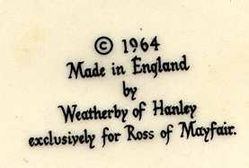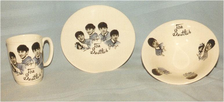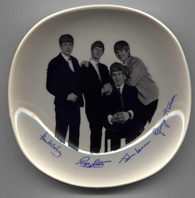 Beatles Pottery was made by a few manufacturers in the 1960's. The majority of items made were done in the UK by The Washington Pottery Company and in the USA by The US Ceramic Company. In the UK, they originally made a plate, a biscuit plate, a cereal bowl, a set of 4 small candy dishes, and a handled mug. Only the 4 candy dishes had a gold leaf edging. Many of these items were marked either England or Washington Pottery however some originals were not marked. Beware of reproductions and other items that were made in the 1980's such as teapots, plates with gold leaf edging. Only the above stated items were made in the 1960's. See also US Ceramic Company and Plate by Ross for other examples of original pottery-type pieces.
