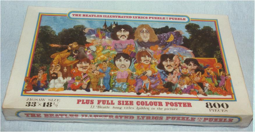 The Beatles Illustrated Lyrics Puzzle in a Puzzle was mfg in a very large colorful box in the UK in 1970. A fully licensed item! Puzzle contained 800 pieces and included an instruction sheet sealed inside an envelope plus a full color large poster. Produced in conjunction with Alan Aldridge's two great books, The Beatles Illustrated Lyrics.