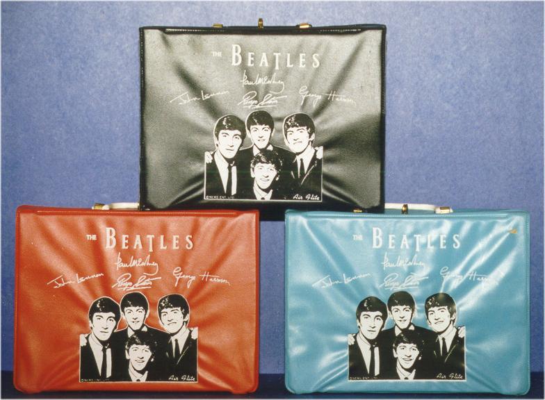 Beatles Lunchboxes mfg by Air Flite USA in 1964. These vinyl carrying cases never came with a thermos and might not have been originally sold as lunchboxes, but today they are considered lunchboxes by most all collectors. Black is the hardest color to locate. The last one pictured with the larger picture of The Beatles is the rarest. See Carrying Cases for more Air Flite products.