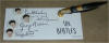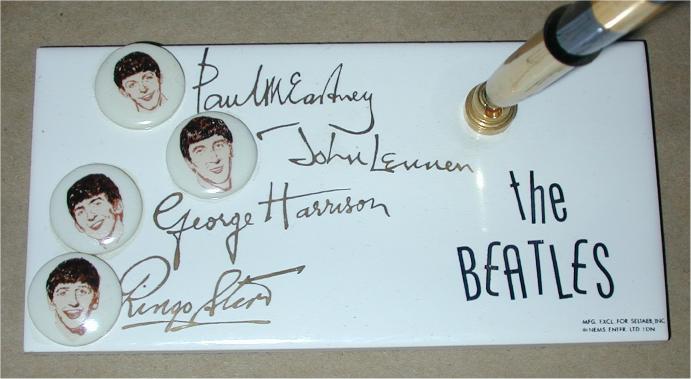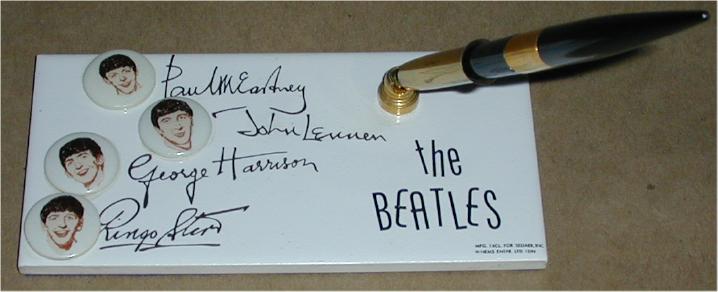 1964 Beatles Pen Holder mfg by the US Ceramic Company in 1964. This rare NEMS Enterprises Ltd fully licensed ceramic desk set pen holder was made by the same company that made many Beatles jewelry items such as bracelets and necklaces plus Beatles ceramic mugs. All use the exact same graphic images. Has a blue felt bottom and brass pen holder with a black plastic pen with brass trim. There are 2 variations found of this pen holder: one has the Beatles signatures in black print while the other one has their autographs in gold print; both styles are shown below. The only other original licensed 1960's licensed penholder made was the Yellow Submarine manufactured by A&M Leatherlines.