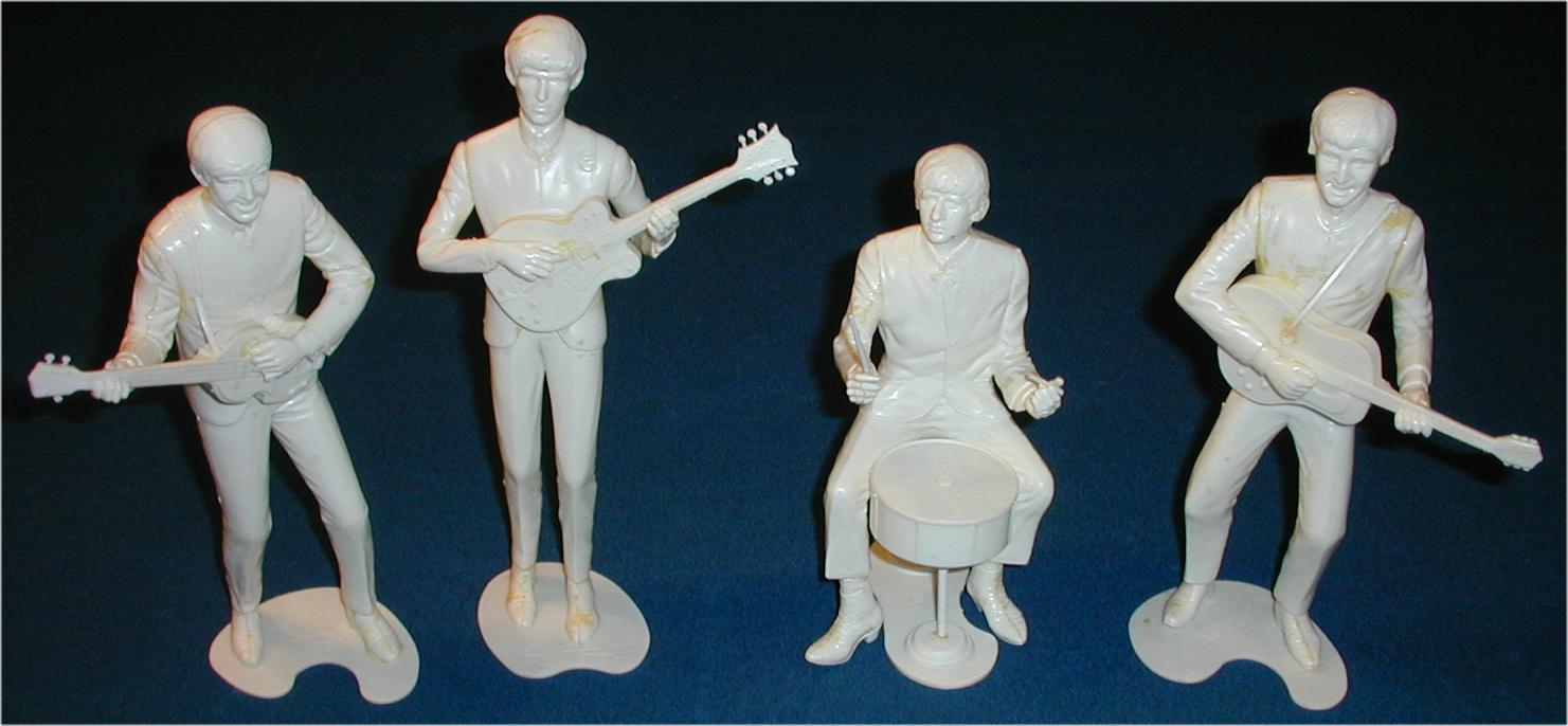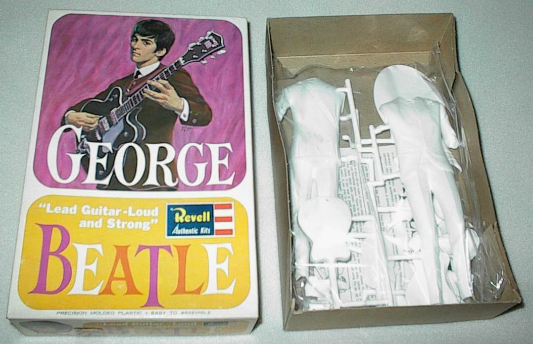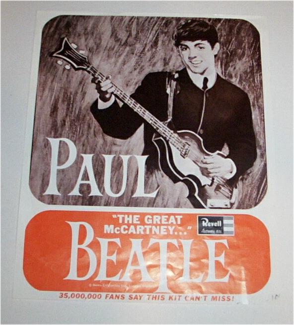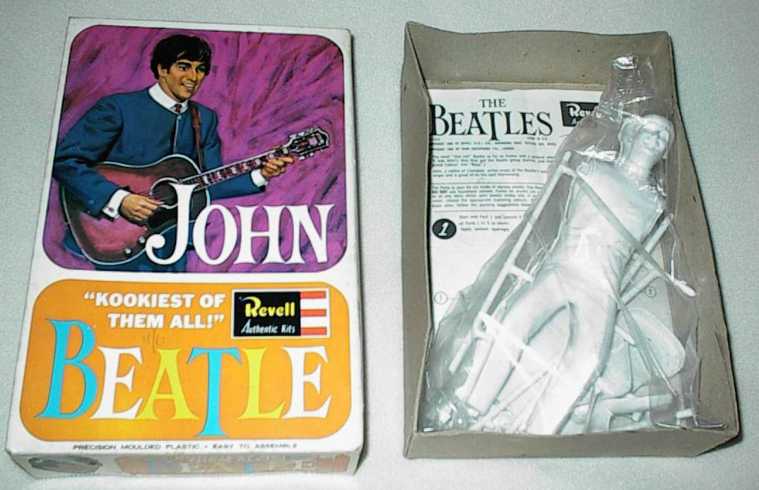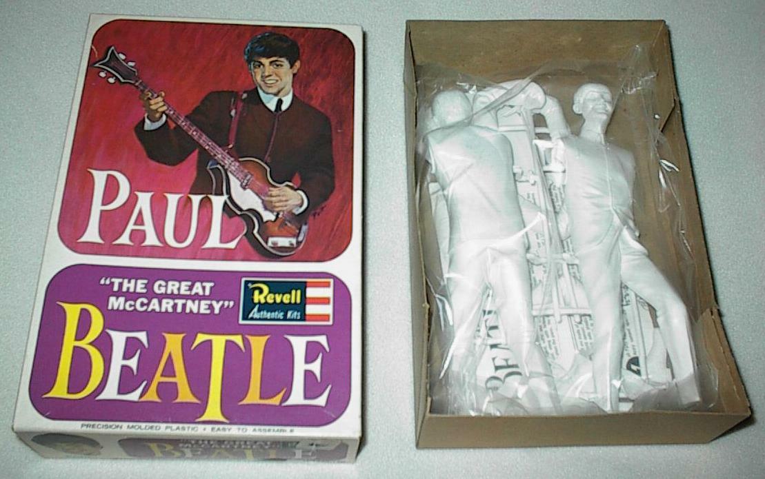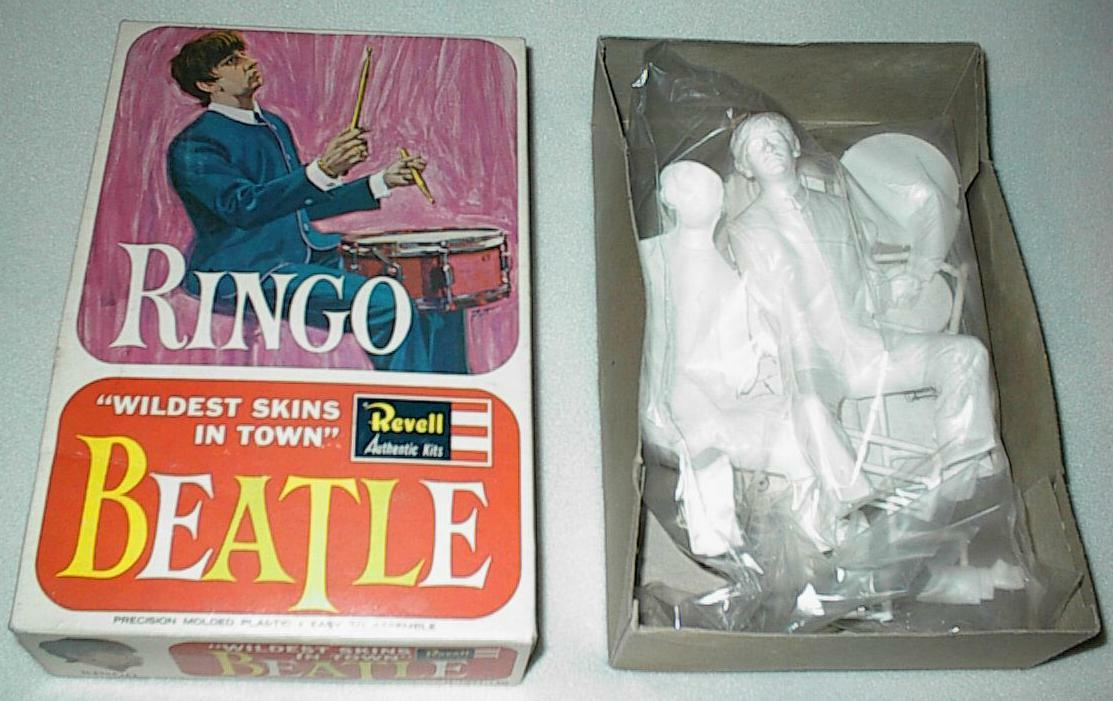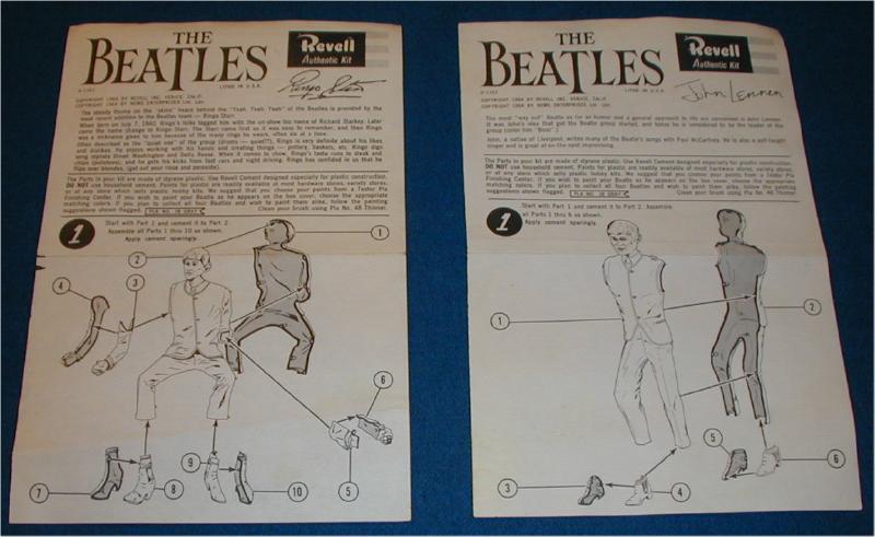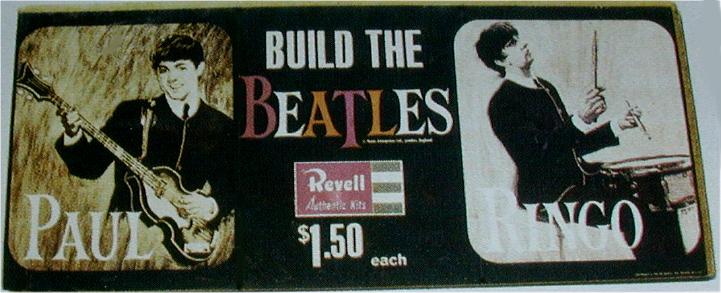 Plastic Model Kits were mfg in the UK and USA in 1964 by Revell. These kits are most desirable when complete and unbuilt. One of each Beatle. There were 2 promotional posters and at least 1 flyer made to promote these kits; one flyer pictures Paul McCartney on one side and Ringo Starr on the other side. One banner-style promotional poster states "Build The Beatles" and shows John and George (photograph courtesy of Rory Williams) while the second banner poster shows Paul and Ringo; both banner posters are quite hard to find.