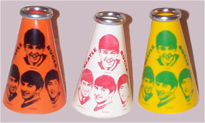 Plastic Beatle Megaphones were sold at many concerts in the USA in 1964. These were mfg by Yell-a-phone. Manufactured in 3 colors, yellow, orange and white each with a metal ring mouthpiece and a long chain to hang around your neck. They are sometimes found with the metal chain inside a small paper envelope taped to the inside of the megaphone; the envelope is marked Yell-a-phone. A small quantity of original megaphones were found a few years ago, all unused with the metal chains still unopened in the small white envelopes.