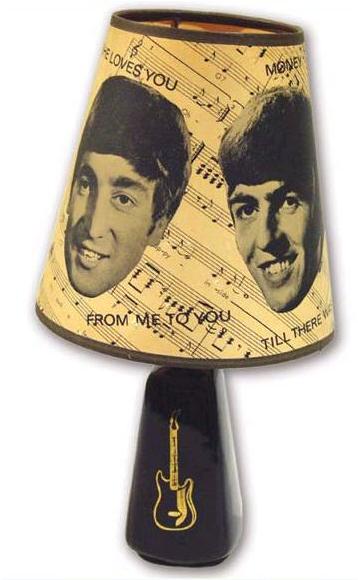 Beatles Lamp mfg in the USA in 1964. There were 2 styles: one with feet and another meant to hang on the wall. 2 different pictures were used on the front - these pictures are just cardboard promo cards available at the time glued onto the lampshades. In the UK a nice lampshade was mfg with the Beatles pictures made right into the paper. This lamp was available separately or on a nice black ceramic base with a gold guitar emblem on the front.