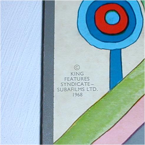 Original Yellow Submarine UK 1 Sheet Posters measure 30" x 40" exactly, are very sharp and clear with very bright colors! The detail and fine print shown below is either missing or not sharp on counterfeit copies.