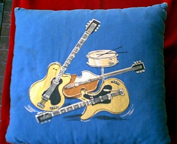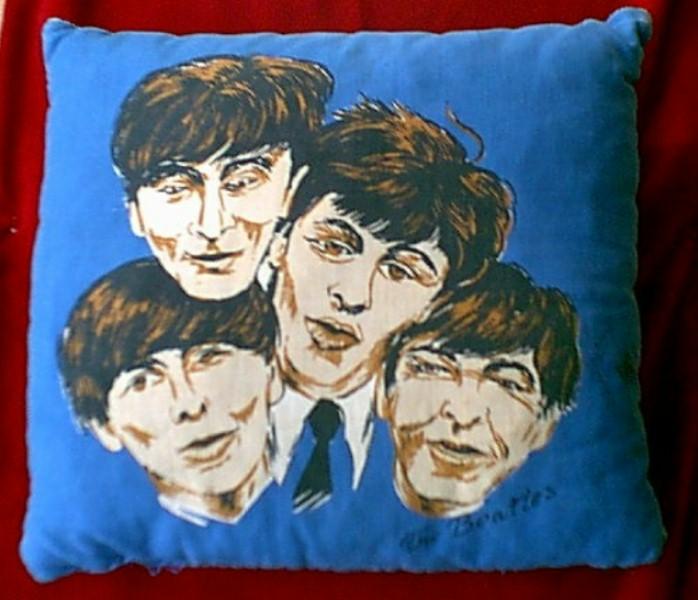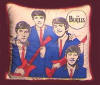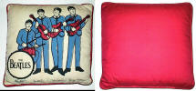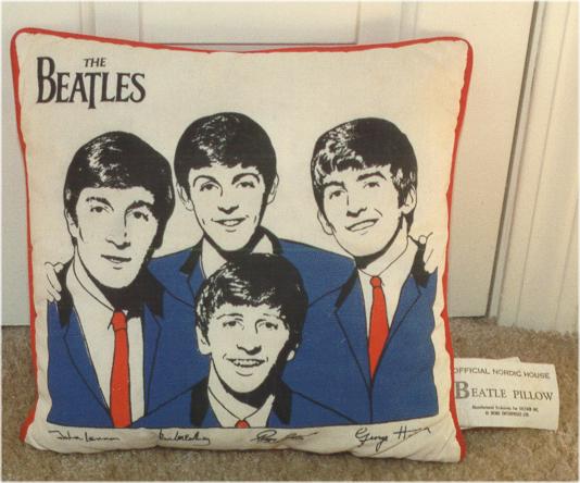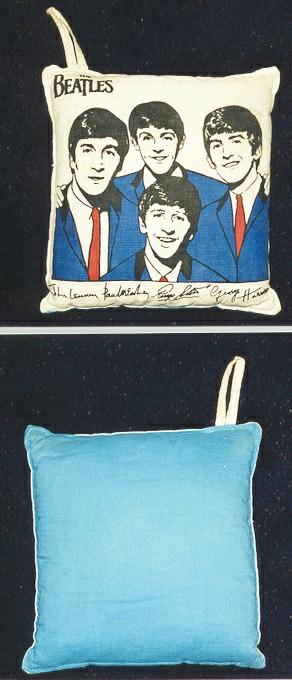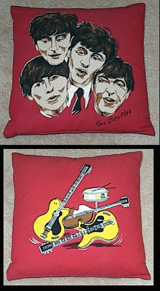 Beatle Pillows were mfg in the USA by Nordic House. There were 4 different variations manufactured by Nordic House: 1. Head and shoulders picture, 2. Head and shoulders picture with carrying strap, 3. Half bodies with guitars, 4. Full bodies with guitars. They were originally issued with 2 cloth tags, one of which states "The Official Beatles Pillow by Nordic House". Also pictured is a red and blue pillow mfg in the UK in the 1960's, manufacturer is not known, very rare.