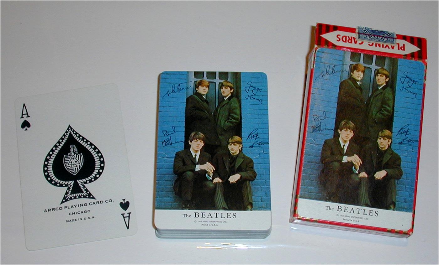 Playing Cards came in only these 3 different types in either single deck(orange or blue cards) or double deck boxes(which contained one of each color deck) in the USA in 1964. These were made in the USA in 1964 by The Arrco Playing Card Company from Chicago Illinois, USA. The Ace of Spades is marked with the manufacturers name. The single blue deck is the hardest to find of the 3 different decks. Sometimes you can find the orange deck with a blue box and the blue deck with the red box; those are the hardest combinations to find. The orange deck in the red box is the easiest to locate. The double deck boxes came in either green or black cardboard. The backside of these boxes are stamped in gold, The Beatles.