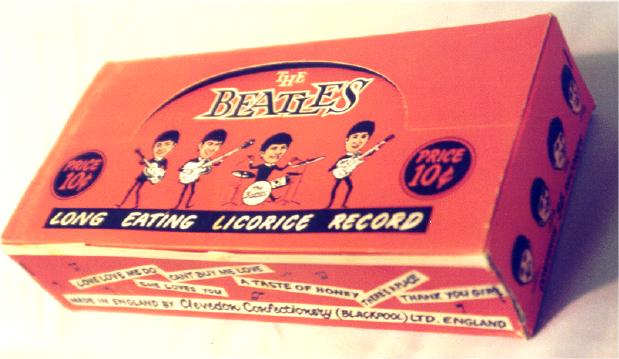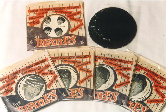 Beatles Licorice Records were mfg in England and sold in the USA and Canada in 1964. Five different designs are known and were sold from an orange cardboard store display box.