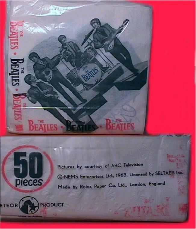 An early piece of original Beatles memorabilia: Beatles Napkins were mfg in the UK in 1963 by The Rolex Paper Company in London England. 50 paper napkins having repeating patterns of Beatles with autographs contained in a poly-bag which was printed with nice graphics.
