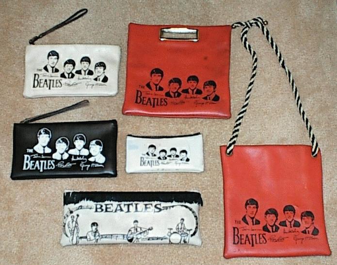 Purses and Handbags came in many sizes and styles. Some were used as pencil cases also. Beware of any that state 1964 on the item itself as these are fakes. Originals were made of heavy material. The small figural purses shown on the far right were not officially licensed items but many collectors like them because they are vintage 1964 items made in Hong Kong.